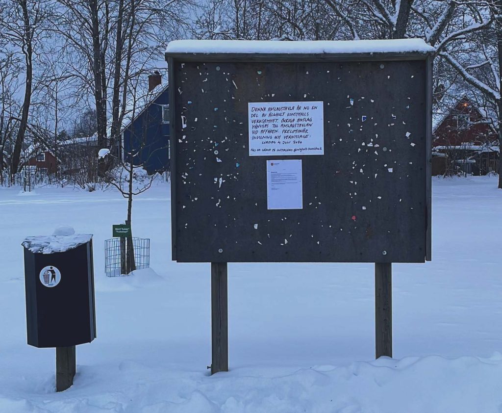 Under 2026-2027 driver jag Älghult Konsthall som en experimentell utställningsplats på en fysisk anslagstavla i Älghult tätort och som en podcast i samarbete med Linnéuniversitetet Design + Change. Projektet stöds av Uppvidinge kommun och Region Kronoberg Bild och form.