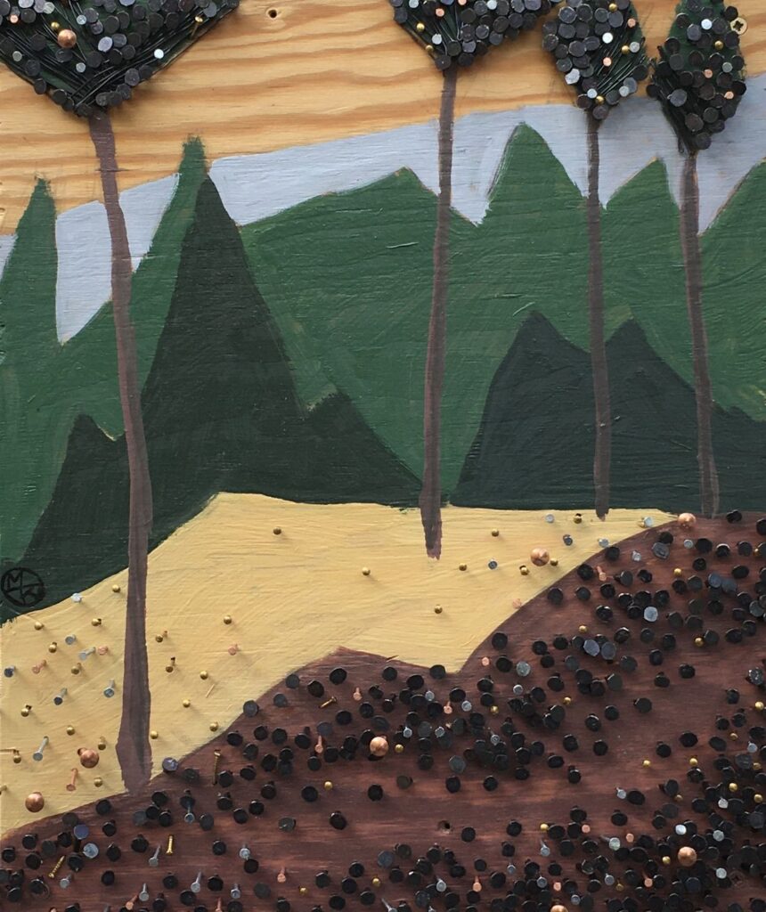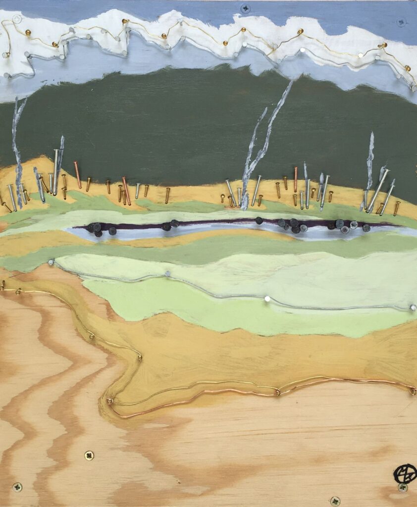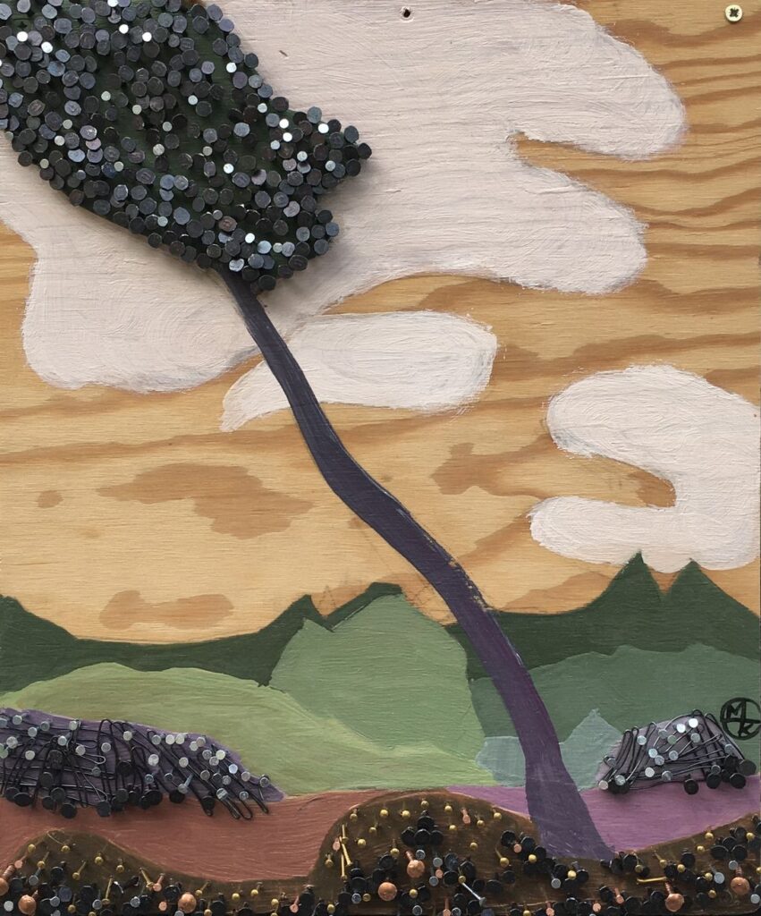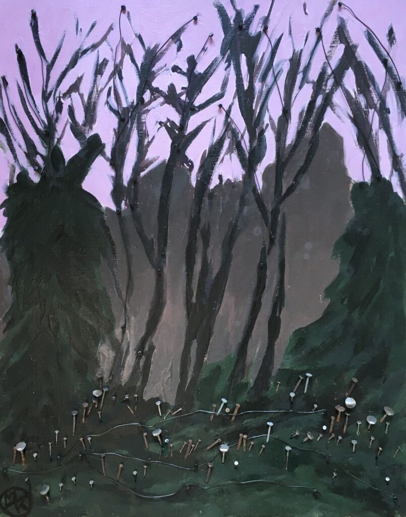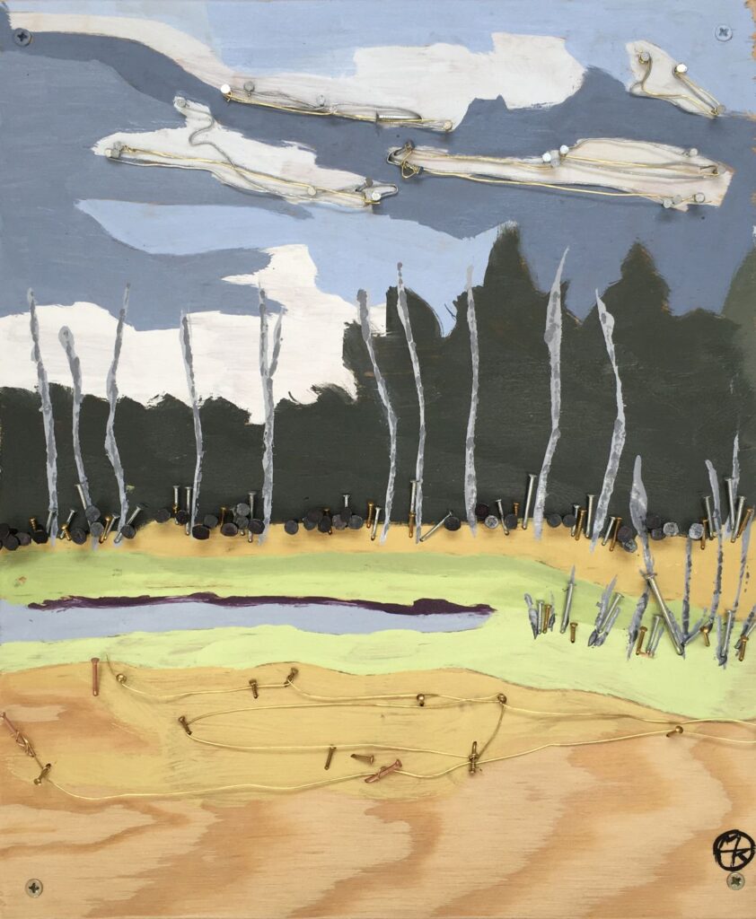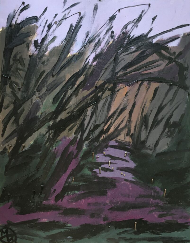 Linoljefärg, spik och spoltråd på plywood. 30 x 40 cm. 2020