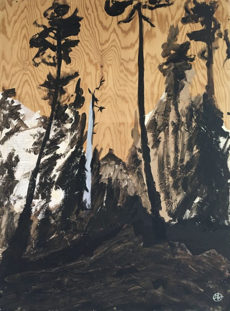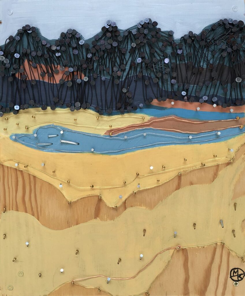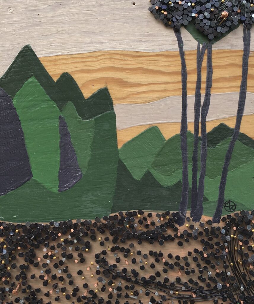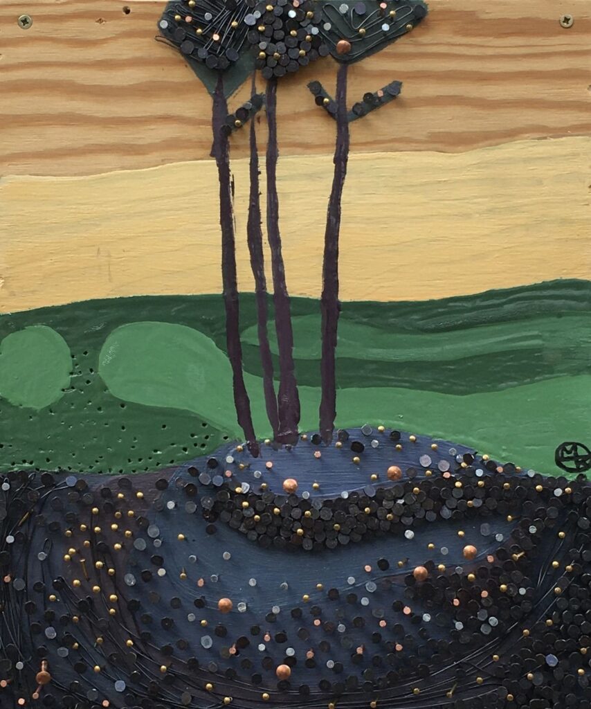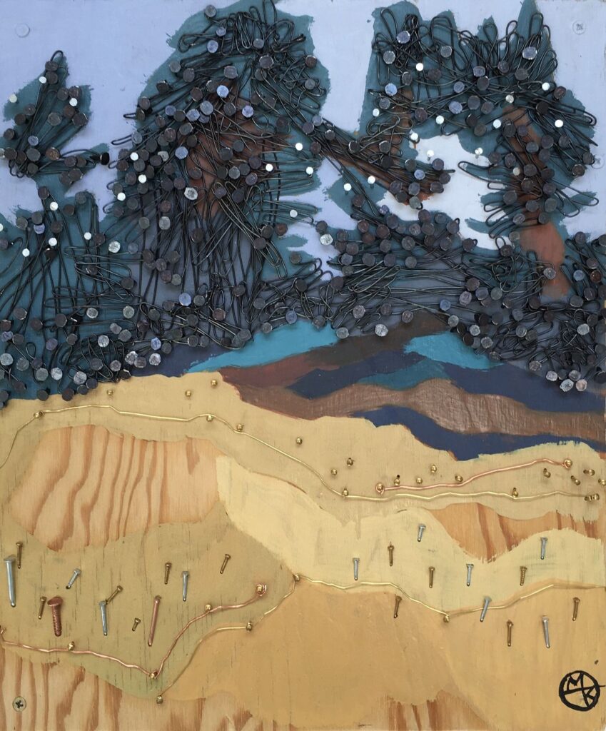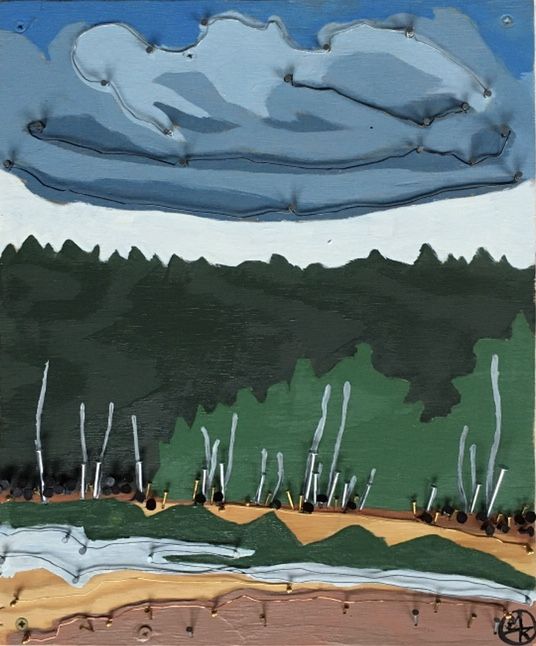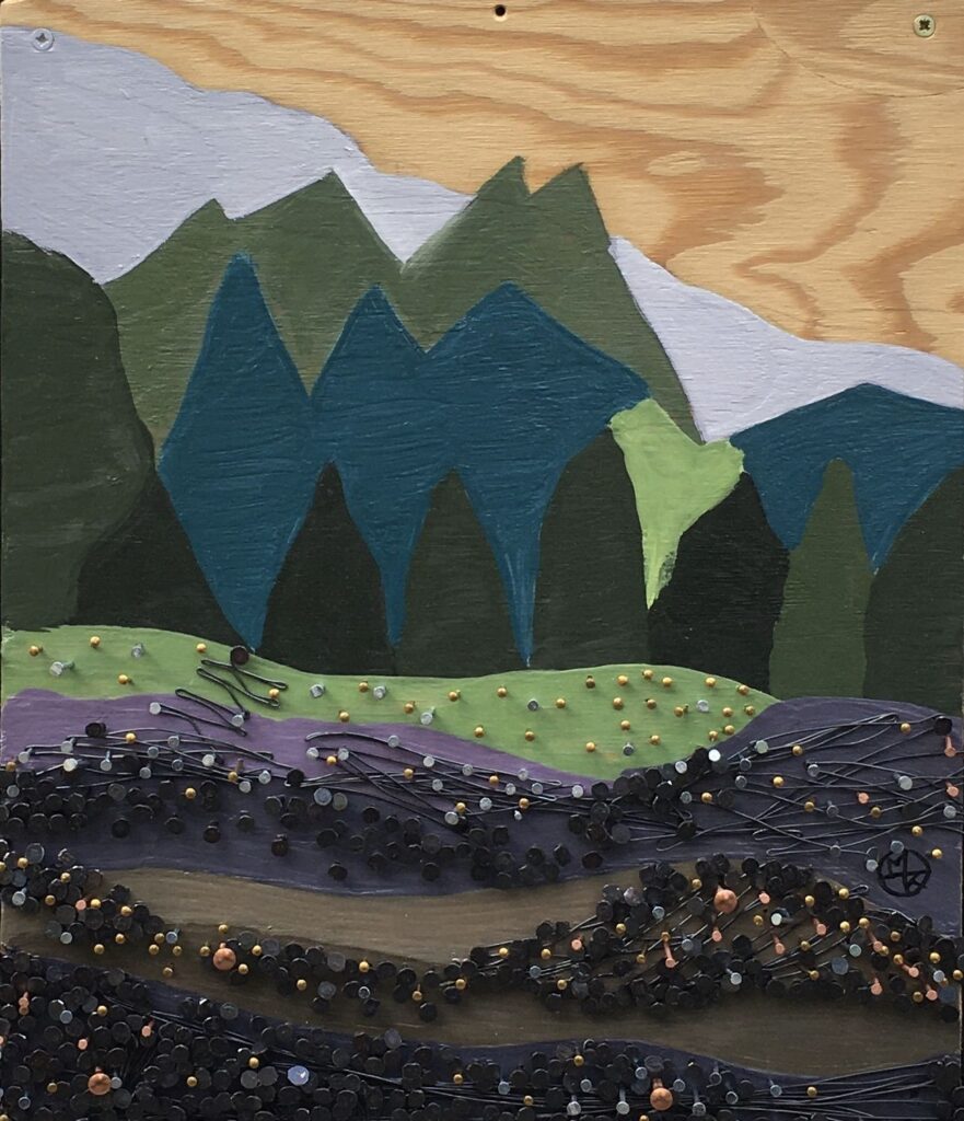 Linoljefärg, spik och spoltråd på plywood. 30 x 40 cm. 2020
