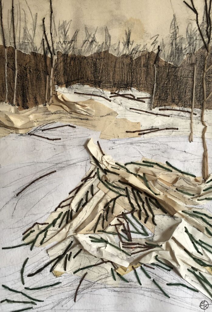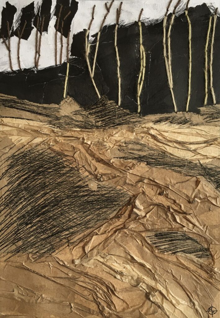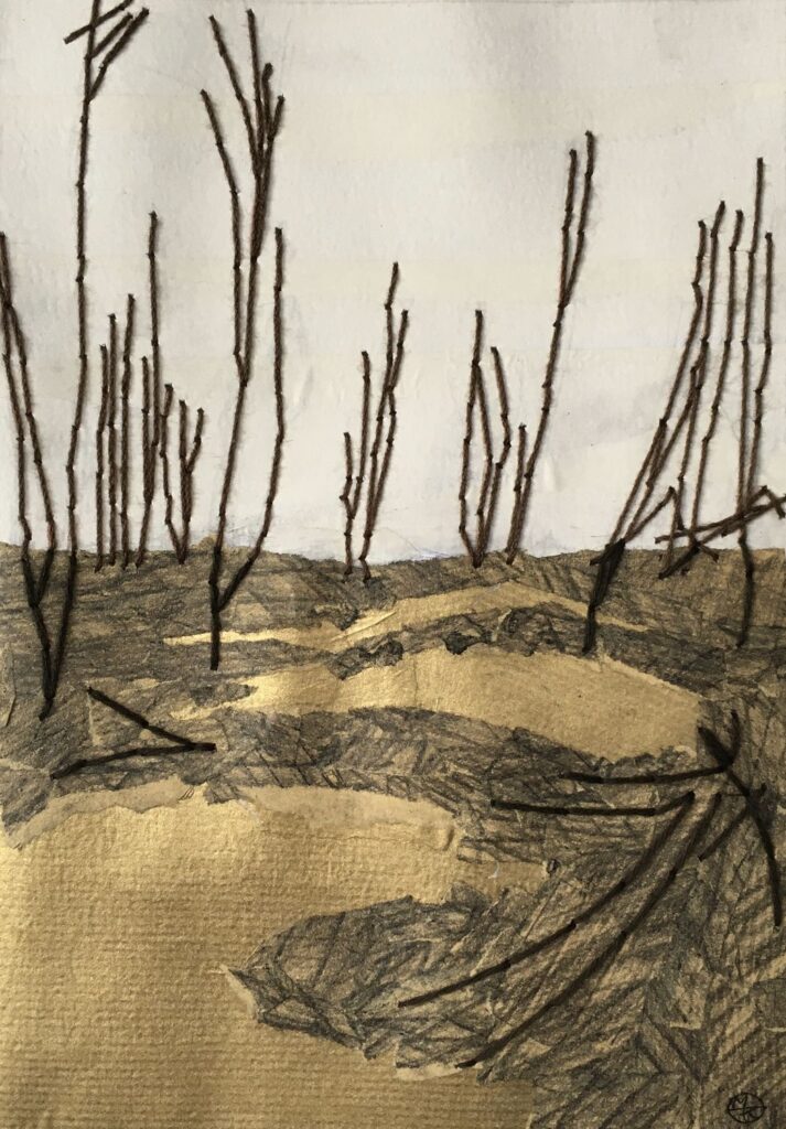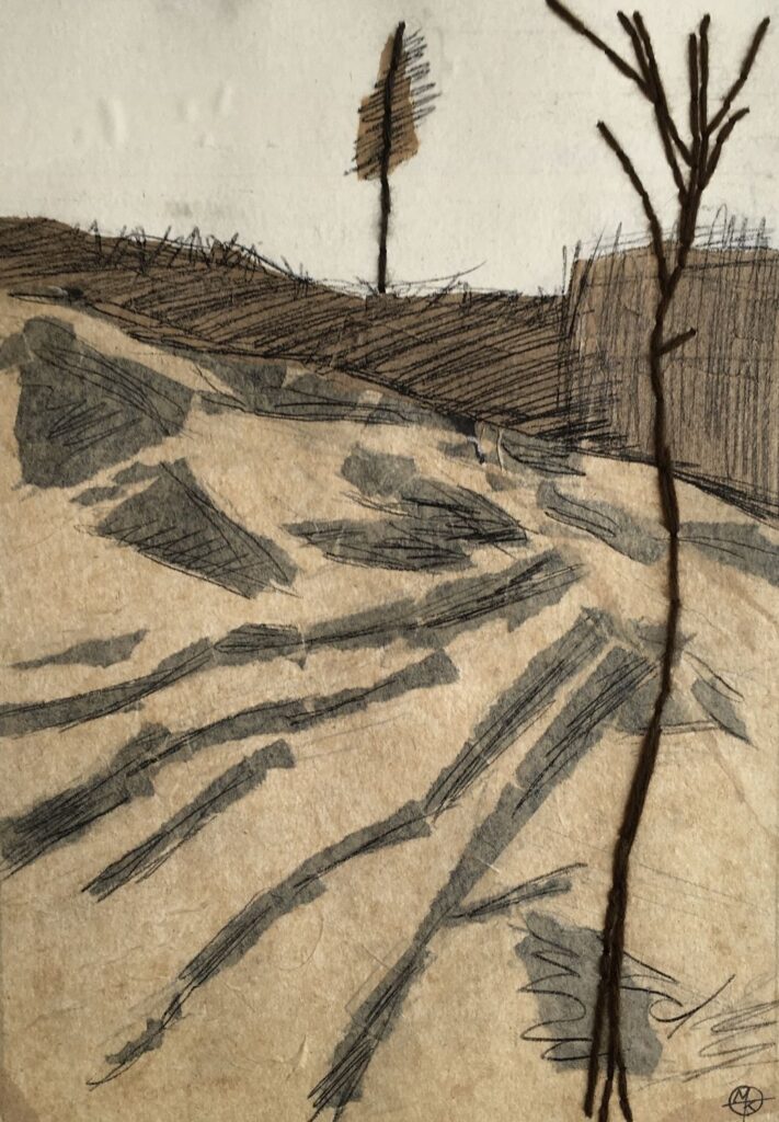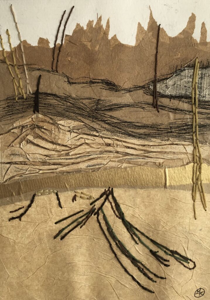 Broderi, grafit och vaxfärg på papperscollage. 20 x 29 cm. Med ram 30 x 40 cm. 2020