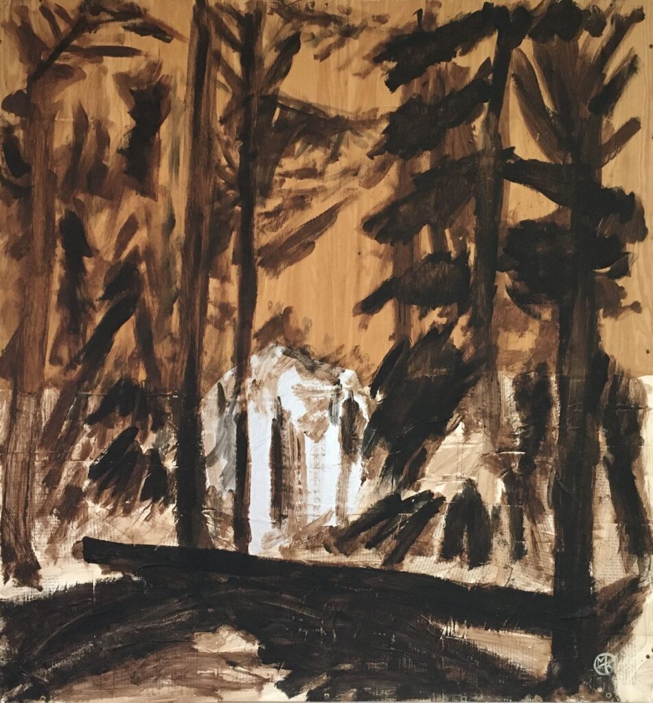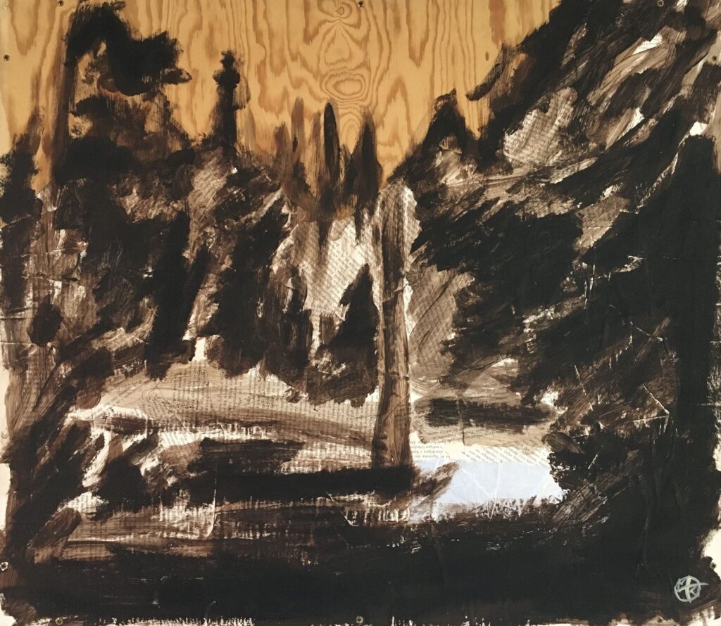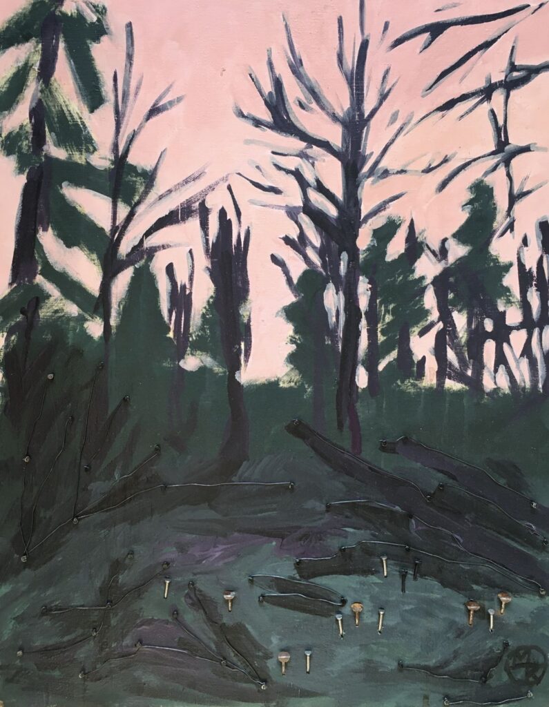 Linoljefärg, spik och spoltråd på plywood. 30 x 40 cm. 2020.