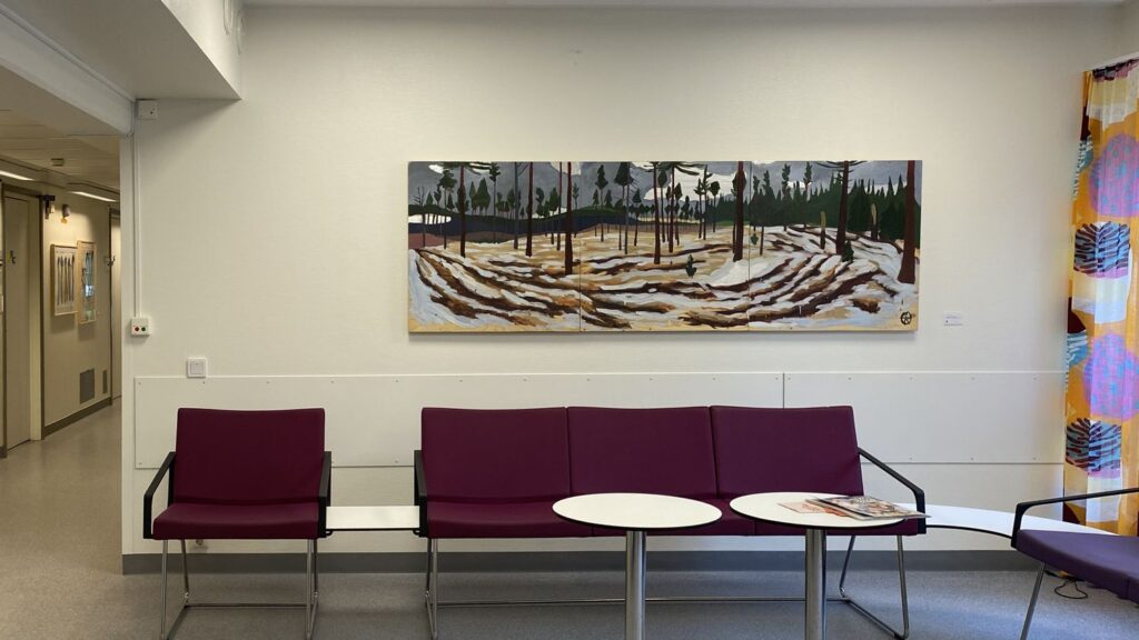 Linoljefärg och metallfolie på plywood. Tredelad, totalt 240 x 80 cm. 2021