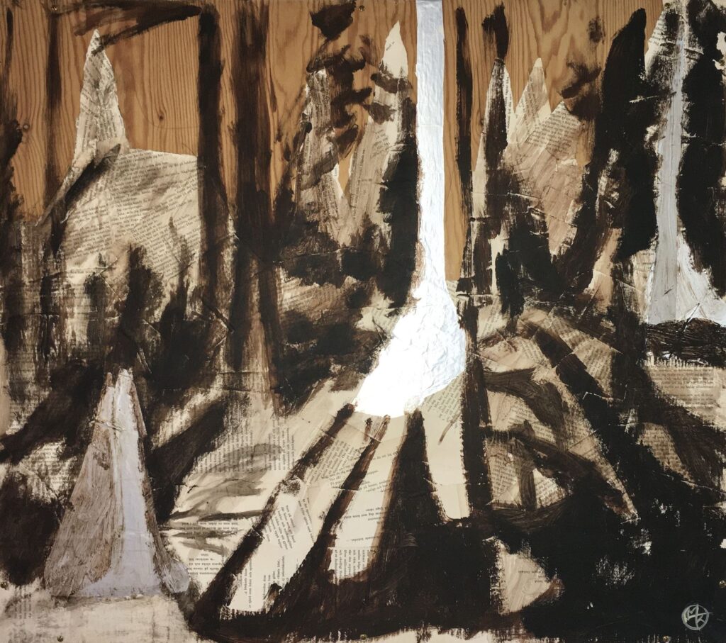 Akryl, metallfolie och papperscollage på plywood. Varierande mått. 2021