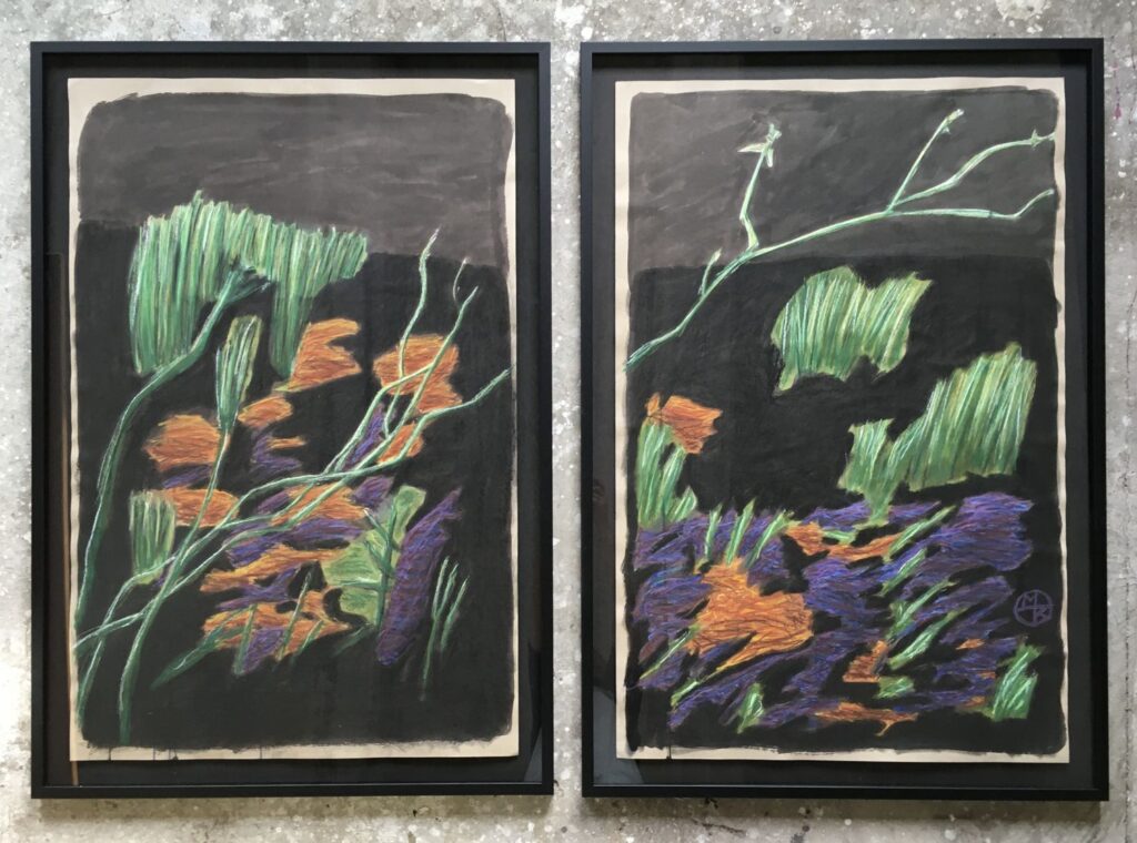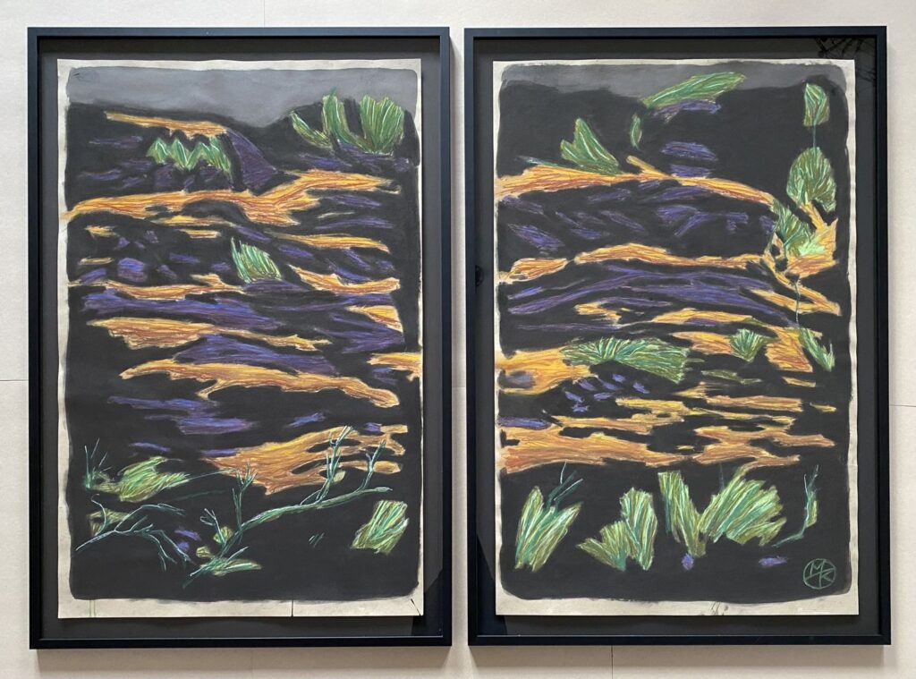 Tusch och torrpastell på papper. Två diptyker bestående av två tavlor om vardera 75 x 115 cm. Med ram 87 x 127 cm. 2021